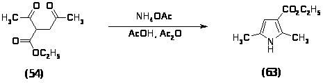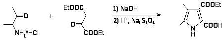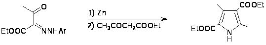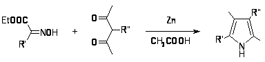 Модификацией этого метода является конденсация предварительно приготовленной соли аминокетона с кетоэфиром в щелочной среде [11]. При этом получаются пирролы, содержащие в положениях 2 и 3 метильные группы, а в положениях 4 и 5 электроноакцепторные заместители. Кроме указанного восстановителя успешно был применен дитионит натрия [12].