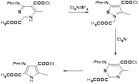 Широко используемым может быть метод получения тетразамещенных пирролов из ненасыщенных тиоамидов, включающий образование изотиазолевых солей в качестве интермедиатов в синтезе тиазинов, при удалении из которых серы образуются тетразамещенные пирролы [23].