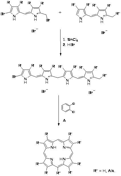 Суть метода заключается в конденсации α–незамещенного пиррола с альдегидом, при этом в конденсацию можно вводить смесь различных пирролов и альдегидов, но при этом образуется смесь из всех возможных комбинаций порфиринов и расширенных порфириновых циклов, содержащих 5 и более пиррольных фрагментов [47,48].