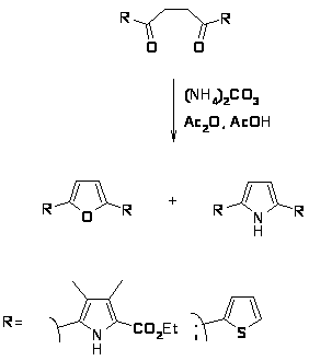 Отмечено также, что реакция может протекать с ацетатом аммония c хорошим выходом (~ 70%), причем, чем более электроноакцепторные заместители в 1,4-дикетоне, тем в более жестких условиях протекает реакция [25].