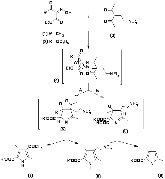 Реакция может протекать либо по пути А с участием ацильной группы; либо по пути Б, когда ацетильная группа участвует в построении гетероцикла. В случае циклизации пентандиона (3) с -диэтиламиноэтильной группой с изонитрозоацетоуксусным эфиром реакция осуществляется по механизму А. Конденсация пентандиона (3) с изинитрозодиэтилмалоновым эфиром происходит по пути Б.