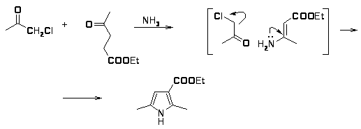 К этой же группе реакций можно отнести получение пирролов по Ганчу из галогенкетонов, -кетоэфиров и аммиака [26].