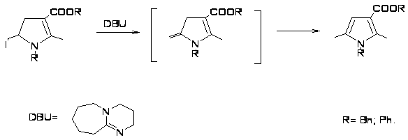Дегидрогалогенирование дигидропиррола производят с помощью основания или без него, причем скорость дегидрогалогенирования подчиняется тем же закономерностям, что и скорость йодоциклизации.