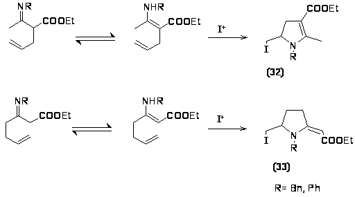Было показано, что продукт электрофильной циклизации зависит от относительного положения алкенильной цепи в енаминокетоне, так из -алкенил-аминокетонов образуется дигидропирролы (32), а из γ-алкенил--аминокетонов- 2-метиленпирролидины (33) [39].