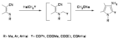 Из- за сложностей возникающих при попытках получить аминопирролы из незамещенных пирролов, был разработан метод синтеза 3-аминопирролов с хорошими выходами при помощи циклизации Торпа Циглера. Метод основан на N-алкилировании -енаминонитрилов - галогенкетонами с последующей внутримолекулярной конденсацией по Торпу Циглеру [41,42].