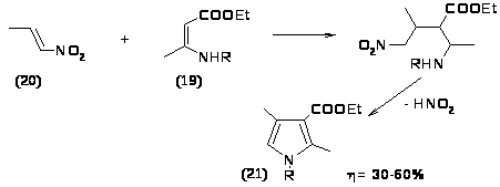 К этой же группе реакций можно отнести образование производных пиррола из N замещенных эфиров -аминокротоновой кислоты (19) и 1-нитропропена (20), которые в реакции типа Михаэля дают аддукт, превращающийся в пирролин, окисляющийся затем в пиррол (21) [31,32].