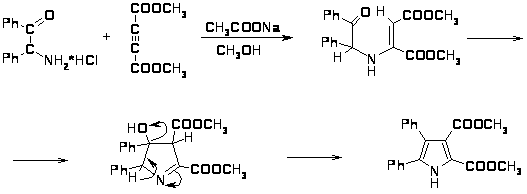 При реакции эфиров ацетиленкарбоновой кислоты с различными нуклеофилами образуются производные пиррола [30]. Первая стадия заключается в присоединении по Михаэлю, образующееся при этом соединение циклизуется затем по ниже приведенному механизму.