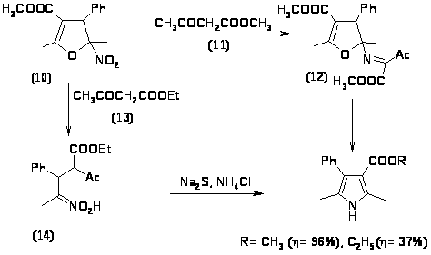 Ещё одним классом соединений, широко используемых в синтезе пирролов, являются нитроалкены [19]. Так при конденсации -метил--нитростирена (10) с метилацетоацетатом (11) образуется промежуточное соединение (12). При конденсации этого же стирена с этилацетоацетатом (13) образуется другое промежуточное соединение (14), однако оба этих промежуточных соединения дают пирролы одного строения.
