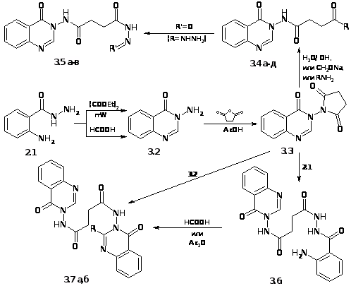 Для синтезу біспохідних 4-оксохіназоліна (3.7а,б) використовували сполуку (3.6), яку одержували нагріванням іміда (3.3) і гідразида (2.1) в середовищі діоксану або сплавленням вихідних речовин. Кращі результати спостерігалися при проведенні реакції в розчиннику. Циклізацією фрагмента антранілогідразида в молекулі сполуки (3.6) отримували відповідні біспохідні. При нагріванні сполуки (3.6) в середовищі мурашиної кислоти утворюється N,N′-ди(4-оксо-3,4-дигідрохіназолін-3-іл)сукцинамід (3.7а). Крім того, сукцинамід (3.7a) був також одержаний сплавленням іміда (3.3) з хіназоліноном (3.2). В цьому випадку реакція перебігала з більш низьким виходом, а підвищення температури або часу нагрівання призводило до руйнування речовин. Спроба провести реакцію між сполуками (3.2) і (3.3) в розчиннику успіху не мала: вихідні речовини були виділені при кип’ятінні реагентів (3.2) і (3.3) в етанолі, діоксані, оцтовій кислоті і в ДМФА. При нагріванні сполуки (3.6) з еквімолярною кількістю оцтового ангідриду в середовищі крижаної оцтової кислоти отримано біспохідне (3.7б).
