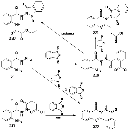 Напрямок реакції змінюється якщо фталевим ангідридом проацильована аміногрупа антранілогідразиду; так, ацилювання кислоти (2.11) фталевим ангідридом і наступним кип‘ятінням в оцтовій кислоті веде до утворення хіназолінону (2.22). Останній був також отриманий при послідовному ацилюванні гідразида (2.1) янтарним і фталевим ангідридами в оцтовій кислоті. Утворення хіназолінону (2.22) є результатом першочергового замикання хіназолінонового циклу, а наступне замикання фталазинового циклу супроводжується одночасним витисненням залишку янтарної кислоти.