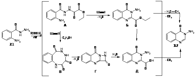 Взаємодією антранілогідразида (2.1) з діетилоксалатом в умовах мікрохвильового опромінення замість очікуваного 3-аміно-2-етоксикарбоніл-4-оксо-3,4-дигідрохиназоліну був одержаний 3-аміно-4-оксо-3,4-дигідрохіназолін (3.2). В спектрі ЯМР 1Н сполуки (3.2) фіксувалися вузький сінглет протонів групи NH>2> ( 5.88 м.д.) і сигнал Н2 хіназолінонового ядра ( 8.37 м.д.), а сигнали протонів алкільного радикала були відсутні. Запропоновано можливі шляхи утворення сполуки (3.2).