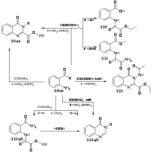 4-Оксо-3,4-дигідрохіназолін (3.14а) та 3-аміно-4-оксо-3,4-дигідрохіназолін (3.14б) були одержані також при мікрохвильовому опроміненні суміші антраніламіду (3.8г) або антранілогідразиду (2.1) з відповідними діалкілоксалатами.