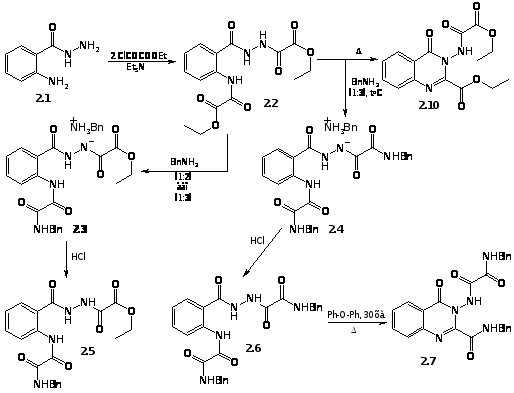 Амидированием диэтоксалилантранилогидразида, в зависимости от соотношения реагентов и температуры, синтезировано бензиламмониевые соли и бензиламид 2-(N`-этоксалилгидразинокарбонил)оксаниловой кислоты и бензиламид 2-(N`-бензиламинооксалилгидразинокарбонил)оксаниловой кислоты, кипячение последнего в дифениловом эфире дает N-бензил-N`-(2-бензилкарбомоил-4-оксо-3,4-дигидрохиназолин-3-ил)оксамид, а при увеличении длительности кипячения – смесь продуктов.