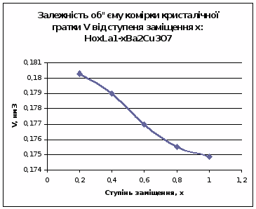 Рентгенографічні дослідження показали, що в системі LnxLa1-xBa2Cu3O7, Ln - Ho зі збільшенням х параметрів a, b, c зменшуються. Одночасно з ростом ступеня заміщення х зменшується й об’єм комірки кристалічної гратки ∆V. Це можна пояснити більшим йонним радіусом Ho3+ у порівняння з йонним радіусом La3+.