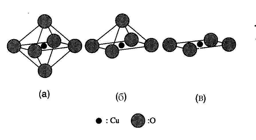 Рис. 1.1. Типи шарів Cu із різною Сu-О координацією: (а) октаедр СuО6, (б) піраміда CuО5, та (в) квадрат СuО4 [15].