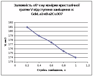 У системі LnxLa1-xBa2Cu3O7, Ln - Gd зі збільшенням х спостерігається зменшення параметрів a, b, c, а також і об’єму комірки кристалічної гратки ∆V, що пояснюється різницею в йонних радіусах Gd 3+ та La3+.