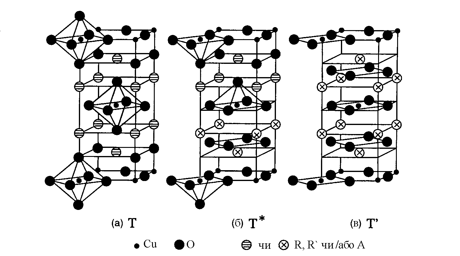 Рис. 1.2. Кристалічні структури купратів 214: фази Т, Т* та Т’ (R, R’ - рідкісноземельні елементи, А = Ba, Sr, Ca,Ce чи Th) [15].