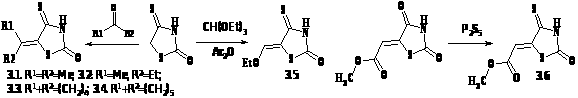 Сучасні вимоги до нових біологічно-активних сполук обґрунтовують створення «лікоподібних молекул» з невисокою молекулярною масою (до 500). Тому з метою заміни арильних та гетерильних субституентів тіопірано[2,3-d]тіазолів на структурно простіші, як гетеродієни у реакції гетеро-Дільса-Альдера досліджено серію 5-алкілідензаміщених ізороданінів (схема 5). 5-Eтоксиметиліденізороданін 3.5 синтезовано за відомим методом (Ead, 1987), 5-(цикло)алкіліденізороданіни (3.1-3.4) одержано взаємодією ізороданіну з 10-15-кратним надлишком відповідного кетону при кімнатній температурі у присутності моноетаноламіну, а для синтезу 5-метоксикарбонілметиленізороданіну 3.6 використано тіонування його 4-оксоаналогу (Р.Б. Лесик, Б.С. Зіменковський, 2004).