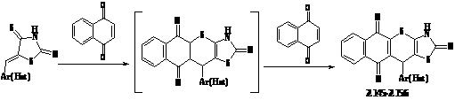 При дослідженні взаємодії 5-арил(гетерил)іден-4-тіоксо-2-тіазолідонів з 1,4-нафтохіноном очікувані продукти [4+2]-циклоприєднання зазнають спонтанної оксидації надлишком нафтохінону, що дозволило одержати ряд 11-заміщених 3,5,10,11-тетрагідро-2H-бензо[6,7]тіохромено[2,3-d]тіазол-2,5,10-тріонів 2.145-2.156, які містять у своїй структурі біофорні фрагменти протиракових лікарських засобів - адріаміцину, даунорубіцину, мітоксантрону та мітоміцину С (схема 4).