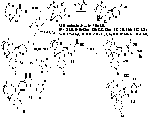 З метою вивчення можливих шляхів хімічної модифікації похідних 9,9-R1,R2-3,7-дитіа-5-азатетрацикло[9.2.1.02,10.04,8]тетрадецен-4(8)-онів-6, які проявили суттєву протиракову та антиоксидантну активності, опрацьовано реакції їх N-алкілювання через відповідні калійні солі. Як алкілюючі агенти для синтезу 4.1-4.7 використано етилхлорацетат та ряд N-арилхлорацетамідів. Гідразинолізом 4.7 одержано гідразид 4.8. З метою синтезу «біфармакофорних» молекул з фрагментом-носієм протипухлинної активності та тіазолідиндіоновим залишком, який повинен забезпечити афінітет до PPAR-г рецепторів, гідразид 4.8 проацильовано хлорангідридом 2,4-тіазолідиндіон-5-оцтової кислоти (4.9). Шляхом нуклеофільного приєднання фенілізотіоціанату (4.10) з наступною циклізацією у лужному середовищі фенілтіосемікарбазидного фрагменту одержано похідне 4.11 з 1-феніл-2-меркапто-1,3,4-тріазолільним фрагментом у молекулі (схема 11).