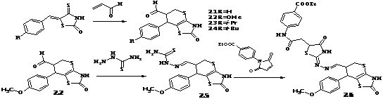 Використання акролеїну як дієнофіла (схема 1) дозволяє синтезувати 2-оксо-7-арил-3,5,6,7-тетрагідро-2Н-тіопірано[2,3-d]тіазол-6-карбальдегіди 2.1-2.4 та функціоналізувати тіопіранотіазолове ядро для наступних хімічних перетворень. Так, взаємодією 2.2 з тіосемікарбазидом одержано тіосемікарбазон 2.5, який у реакції [2+3]-циклоконденсації з N-(4-етоксикарбонілфеніл)малеїнімідом утворює похідне тіопірано[2,3-d]тіазолу з 4-тіазолідоновим фрагментом у боковому ланцюзі (2.6). Структура одержаних сполук підтверджена ПМР спектрами, причому КССВ (J = 4,5-4,7 Гц) дублету протону в положенні 7 (д = 4,23-4,27 м.ч.) вказує на його відносне транс-розташування до протону в положенні 6.