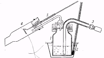 Лабораторный сосуд для перегонки с перегретым водяным паром. 1 – медный куб, 2 – масляная баня с термометром, 3 – соединение спароперегревателем, 4 – холодильник, 5 – приспособ для проталкивания.