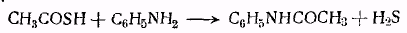Для ацетилирования аминов рекомендуется также пользоваться тиоуксусной кислотой. Преимущество этого способа состоит в том, что ацетилирование анилина и его гомологов протекает в этом случае на холоду. Реакция протекает с выделением сероводорода.