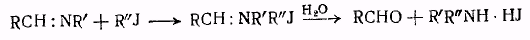 Другой интересный способ получения вторичных аминов основан на взаимодействии азометинов с йодистыми алкилами, причем образуются соединения, которые по прибавлении воды или спирта расщепляются на вторичный амин и альдегид.