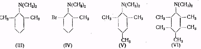 Диметилмезидин (V) и диметиламинопентаметилбензол (VI) также не способны к образованию четвертичных аммониевых соединений