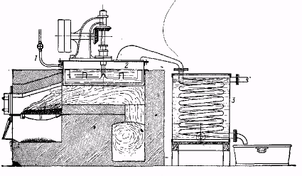 Производственная установка для перегонки с перегретым водяным паром а-нафтиламина, дифениламина и т. д. 1 – ввод перегретого водяного пара, 2 – перегонный сосуд с медленно вращающейся мешалкой, 3 – змеевиковый холодильник.