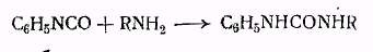 Эта реакция аналогична превращению циановокислого аммония в мочевину. Следующие примеры иллюстрируют применение этого способа. Первичные и вторичные амины легко реагируют с эфирами изоциановой кислоты с образованием производных мочевины. Обычно для этой цели применяют фенилизоцианат, который нагревают с эквимолекулярным количеством амина в каком-либо не содержащем гидроксила растворителе, например в петролейном эфире.