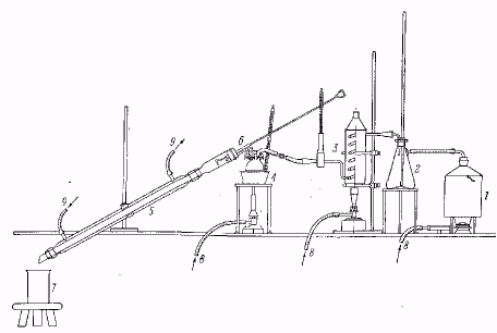 1 – парообразователь, 2 – водоотделитель, 3 – пароперегреватель, 4 – перегонный сосуд в масляной бане, 5 – холодильник с широкой трубкой. 6 – приспособление для проталкивания твердого вещества, застрявшего в холодильнике, 7 – приемник для дистиллята, 8 – газовая горелка, 9 – водяное охлаждение.