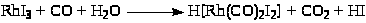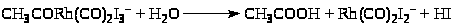 В условиях, когда концентрация воды в СН3СООН > 8% (масс) переход Rh(I) в Rh(III) в стадии (18) является медленной стадией. Распад ацильного комплекса до CH3COI и Rh(CO)2I2– или под действием Н2О (или МеОН) приводит к образованию СН3СООН