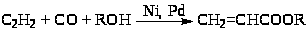 В реакциях СО с олефинами и алкинами участвуют также молекулы других реагентов – Н2О, ROH, RNH3 и др. Эти процессы были открыты В. Реппе в начале 40-х гг XX века и протекают в растворах комплексов Ni(0, II) и Pd(0, II). Например,