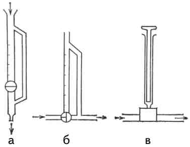 Рис. 2. Расходомеры: а—типа бюретки; б—с подачей растворителя снизу; а — пузырьковый