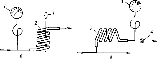 Рис.1 Варианты включения демпфера в хроматографическую систему 1 — манометр; 2 — демпфер; 3 — поперечное сечение демпфера; 4 — запорный кран