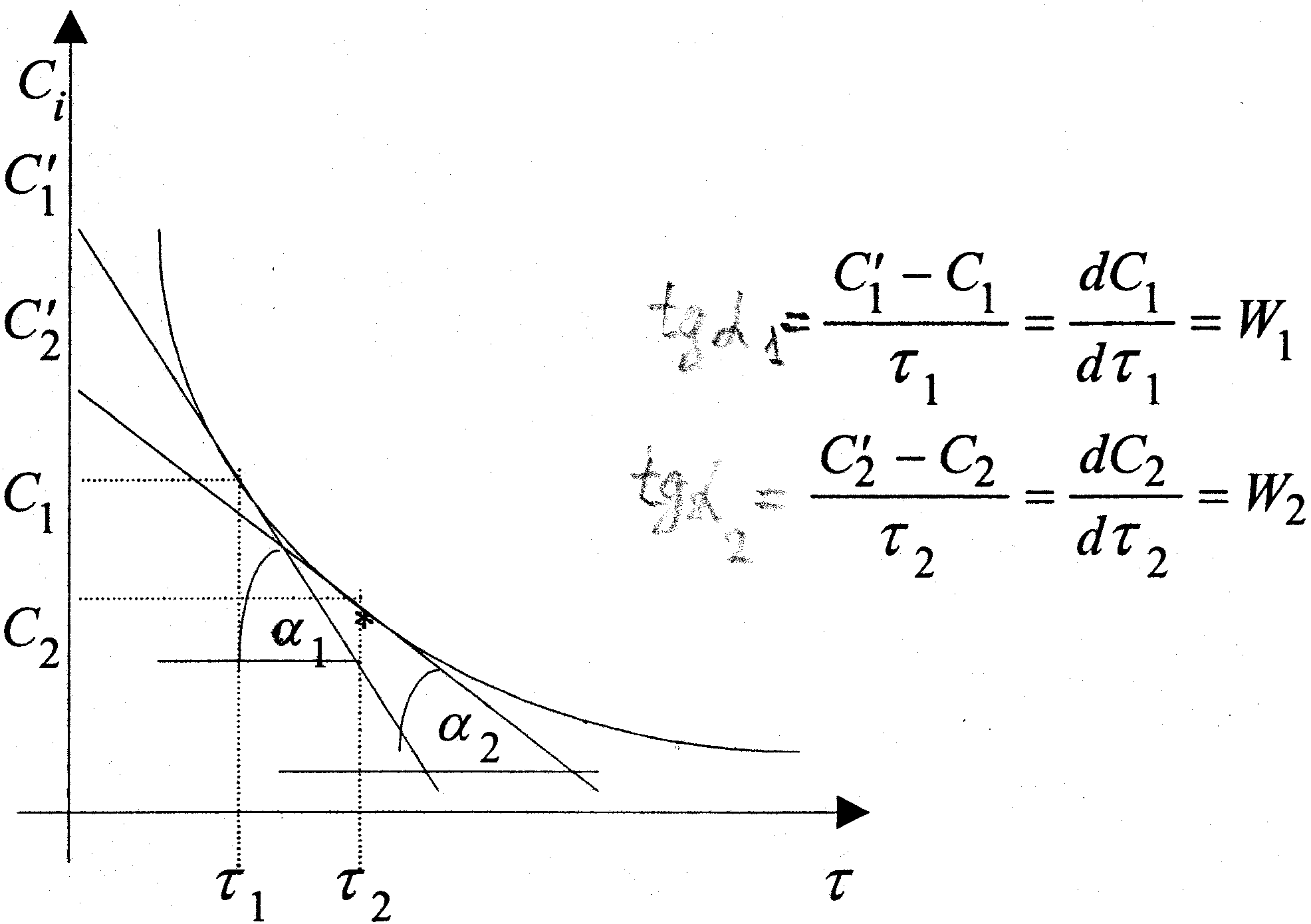 C>i>- τ>i> (рисунок 5). Скорость реакции в заданные моменты времени τ>i> находят проведением касательных к экспериментальной кривой по величине тангенса угла наклона этих касательных (графическим дифференцированием):