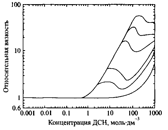 Рис. 6. Относительная вязкость растворов желатина в зависимости от концентрации добавленного додецилсульфата натрия; концентрация желатина: 0, 2.0, 3.0, 5.0, 7.0 и 100 мас.%