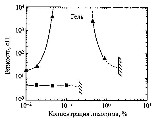 Другое проявление дифильного характера белков обнаруживается при добавлении белка к раствору гидрофобизированного полимера. При добавлении лизоцима к раствору гидрофобизированного полиакрилата происходит значительное увеличение вязкости, однако при более высоких концентрациях белка вязкость понижается до исходного значения. Это очень похоже на эффект мицеллярных ПАВ при введении их в растворы полимеров. Причина в структурном сходстве глобул белка и мицелл ПАВ: наличие гидрофобного ядра и гидрофильной поверхности.