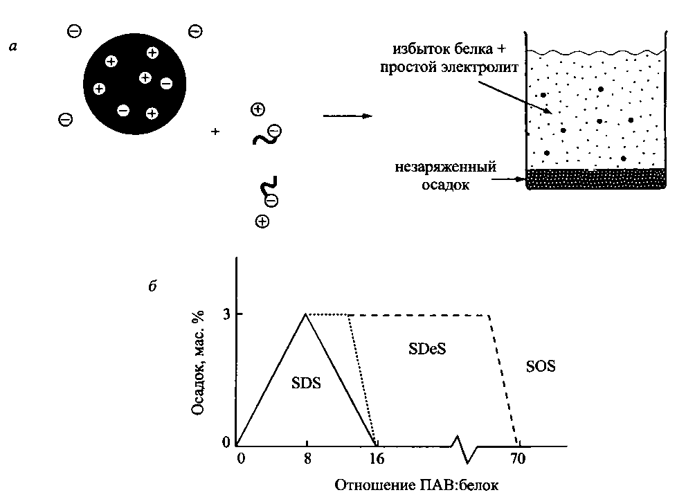 Осаждение положительно заряженного белка при связывании анионных ПАВ — обычное свойство таких систем; при более высоких концентрациях ПАВ вновь происходит растворение осадка. Здесь опять проявляется общность свойств смешанных растворов ПАВ-белок с растворами смесей заряженных полимеров и противоположно заряженных ПАВ с той лишь разницей, что пары белок-ПАВ ведут себя намного сложнее. В этом можно убедиться на примере смесей растворов лизоцима и додецилсульфата натрия.