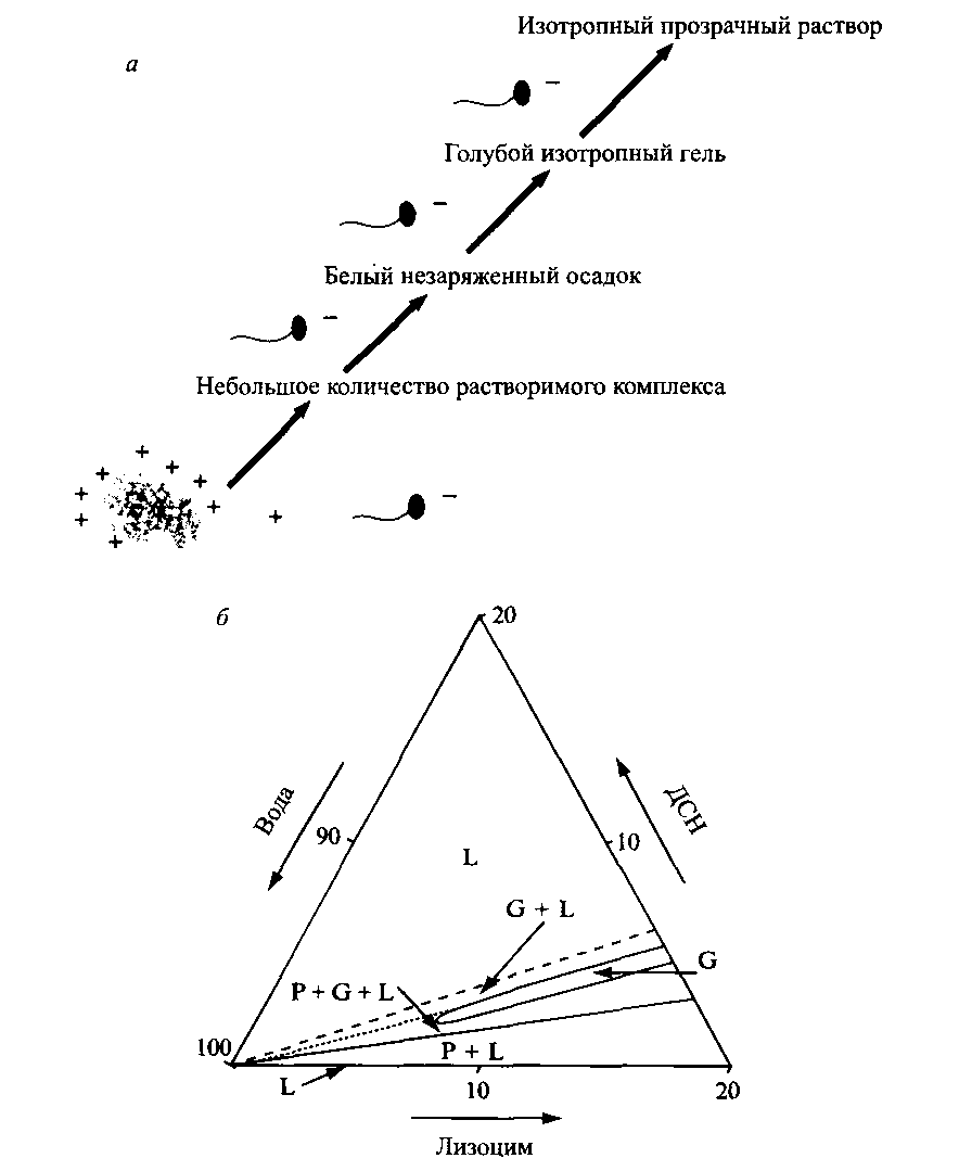 Рис. 9. а — Последовательность изменений свойств образцов при добавлении додецилсульфата натрия в раствор лизоцима.. б — Фазовая диаграмма, схематически показаны области существования раствора, геля и осадка, а также двух- и трехфазные области