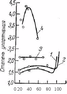 Рис.8. Зависимость степени уплотнения полиакрилонитрильного волокна от растворителя в осадительной ванне: 1 – диметилформамид; 2 – диметилсульфоксид; 3 – 51%-ный раствор роданида натрия; 4 - 85%-ный раствор этиленкарбоната