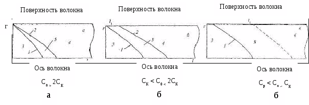 Области протекания коагуляции по тому или другому механизму иллюстрируются на рис.14, где схематично дается продольное сечение волокна, формующегося в осадительные ванны разной коагулирующей способности: жесткие, мягкие и сверхмягкие.