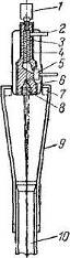 Рис.12. Схема прядильной головки для формования полиакрилонитрильного волокна из размягченного полимера: 1 - привод шнека; 2 - устройство для загрузки пластифицированного сополимера; 3 - шнек; 4 - электрообогрев; 5 - прядильный насос; 6 - дополнительный электрообогрев; 7 - место отсоса газо- и парообразной смеси (в том числе пары пластификатора); 8 - фильера; 9 - обдувочная шахта; 10 - шахта с обогревом |