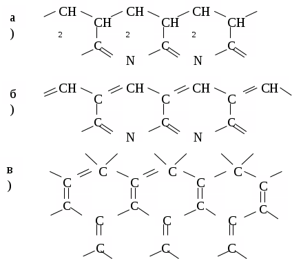 Теплостойкость ПАН-волокон и нитей сравнительно низкая, так как при температурах 1000С и 1500С они теряют 20-23% и 50% исходной прочности соответственно. Однако, для ПАН нитей характерна способность к полимераналогичным превращениям при длительном выдерживании их при температурах более 200оС в присутствии кислорода. В результате окислительных процессов происходит циклизация ПАН (рис.3, а,б), волокно чернеет и становится нерастворимым, снижается прочность, но повышается устойчивость к действию температур. Дальнейший прогрев окисленного ПАН-волокна до 10000С (карбонизация) и 20000С (графитация) приводит к образованию углеродного волокна (рис.3, в), которое способно эксплуатироваться при температурах 2000-30000С, обладая достаточной прочностью и модулем упругости [5].