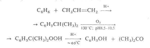 В промышленности ацетон получают преимущественно так называемым кумольным способом одновременно с фенолом из бензола и пропилена через изопропилбензол (кумол) по схеме: