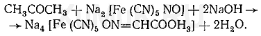 2. Реакция с нитропруссидом натрия. Ацетон с нитропруссидом натрия в щелочной среде дает интенсивно-красную окраску. При подкислении уксусной кислотой окраска переходит в красно-фиолетовую: