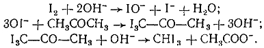 Реакция образования йодоформа. При взаимодействии ацетона с раствором иода в щелочной среде образуется йодоформ: