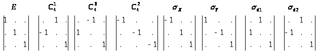 Можно построить для каждого преобразования группы матрицы размерностью 3х3, определяющие преобразование точки трехмерного пространства. Для группы C>4v> каждому преобразованию симметрии можно сопоставить следующие матрицы преобразования пространства:
