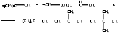 При катионной сополимеризации изобутилена с изопреном первый значительно активнее. Так, при использовании AlCl>3> и метилхлорида относительные константы сополимеризации составляют: r>1> (изобутилен) r>2 >(изопрен)=0,40. Это приводит к тому, что при полимеризации в реакторе периодического действия концентрация изобутилена понижается быстрее, возрастает доля изопрена в смеси мономеров и появляются различия в интегральном и дифференциальном составах сополимеров. С увеличением содержания изопрена в реакционной смеси возрастает ненасыщенность полимера, но снижается его молекулярная масса, поэтому на практике дозировка изопрена в исходной смеси не превышает 4-5% от массы изобутилена.